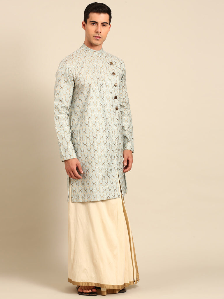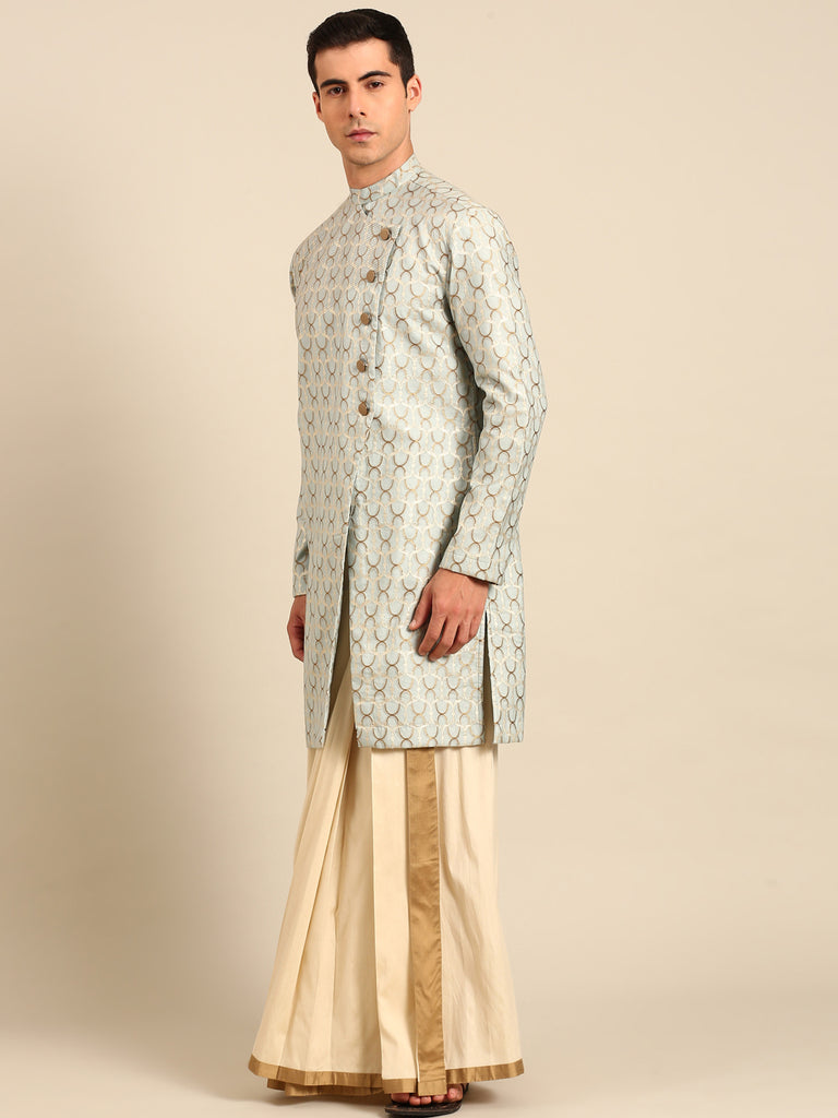 These beige silk-cotton dhoti skirt features delicate gold detailing, blending tradition with a modern silhouette. Elegant, lightweight, and effortlessly festive - a statement of refined luxury.