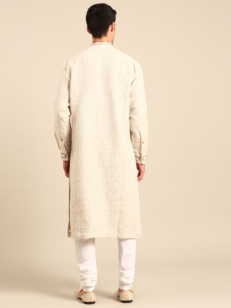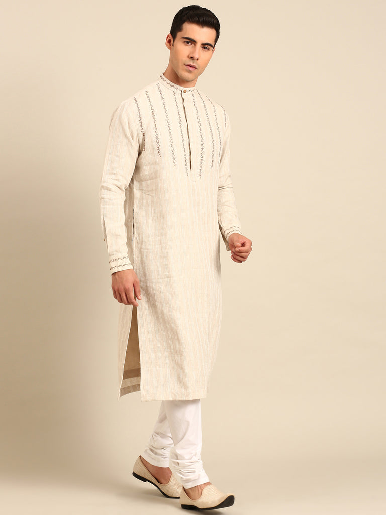 Crafted in linen jacquard, this beige kurta set features subtle brown thread work on the chest for a touch of understated detail. Effortlessly elegant and breathable, it’s perfect for daytime celebrations and festive occasions.