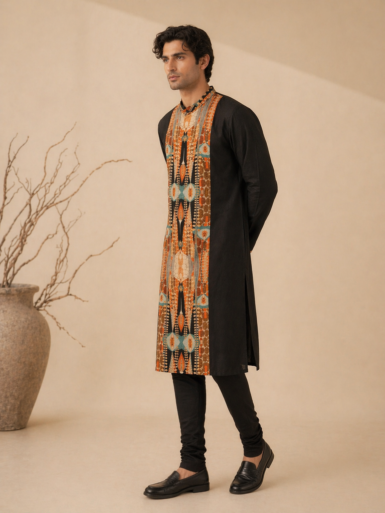 The true beauty lies in the dual-texture composition: a sleek, obsidian Bemberg silk frame meets a central muslin "canvas" featuring a complex geometric lattice in earthy amber and terracotta tones. The sharp, tailored silhouette and concealed placket offer a modern, high-fashion frame for elite evening celebrations.