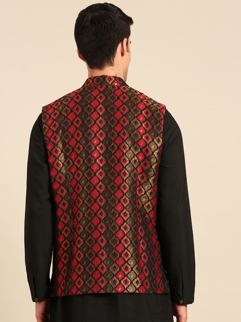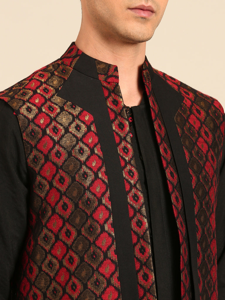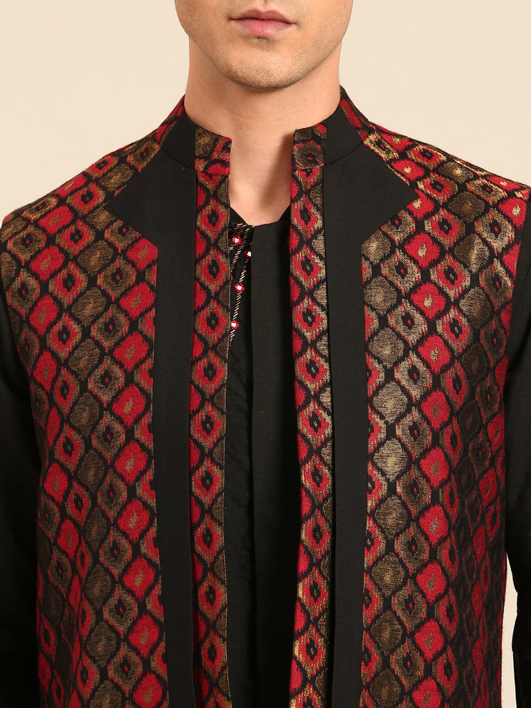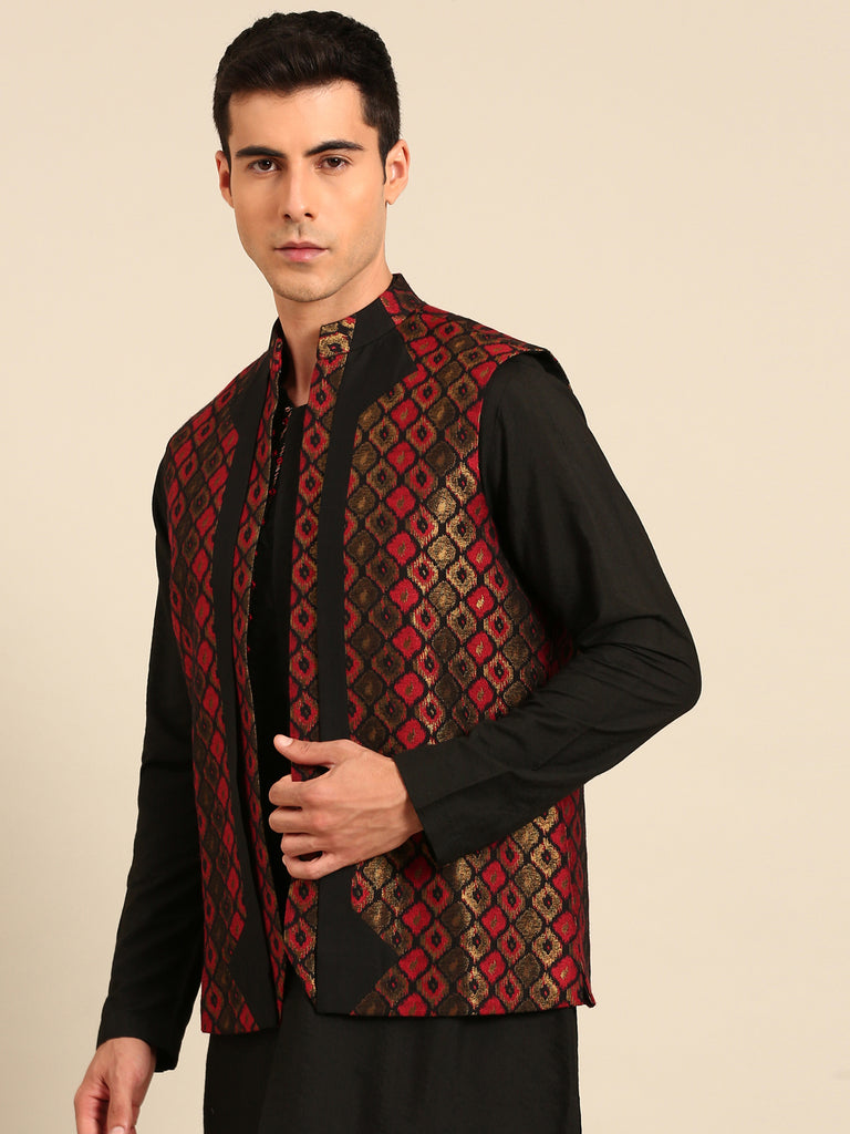 This black and maroon 100% silk jacquard short open jacket features a subtle print, adding depth and character to its luxurious design. Perfect for festive gatherings, receptions, or evening celebrations, it pairs elegantly with a solid kurta set or tailored trousers for a statement-making look.