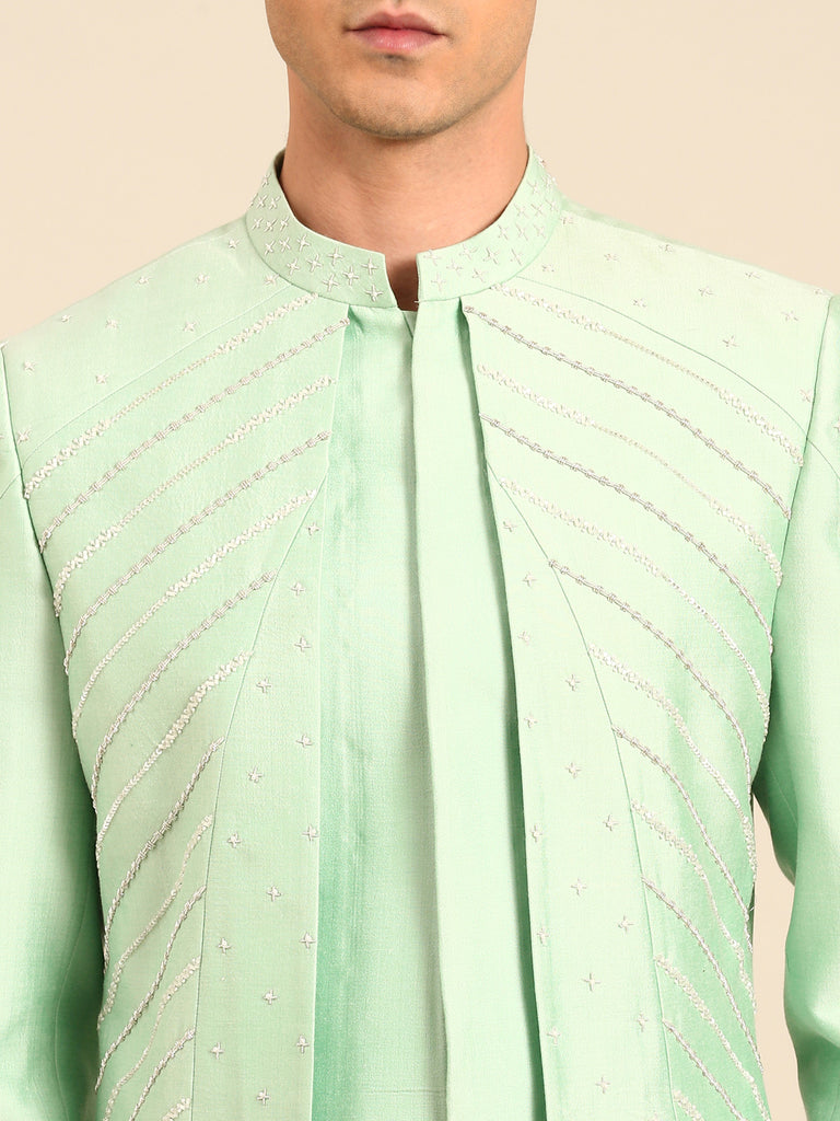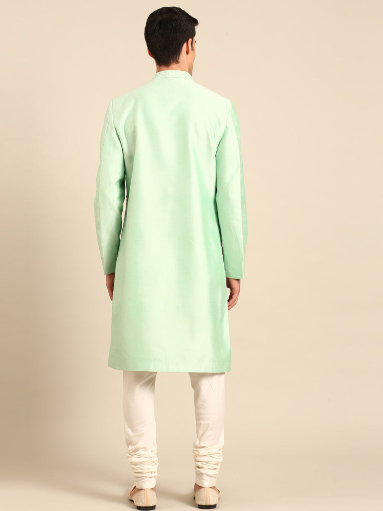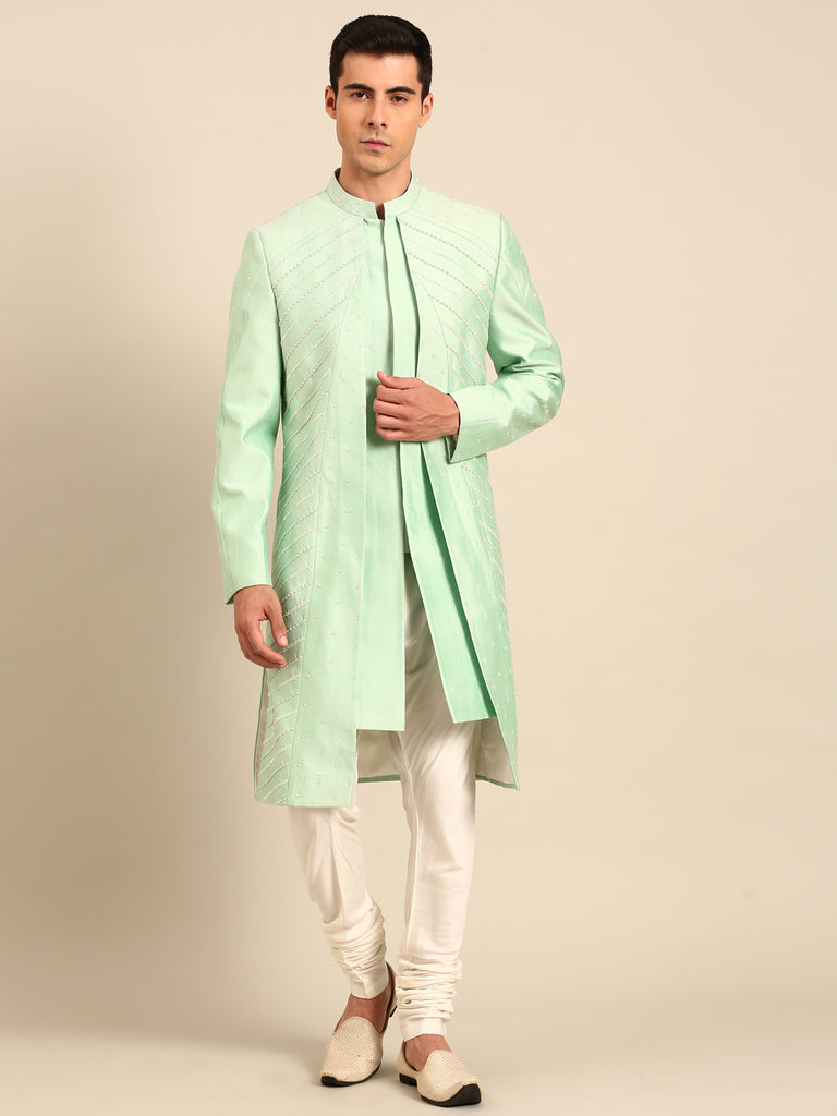 Crafted in soft silk-cotton, this light green sherwani exudes subtle elegance and refined charm. Ideal for daytime weddings, festive occasions, or sophisticated celebrations.