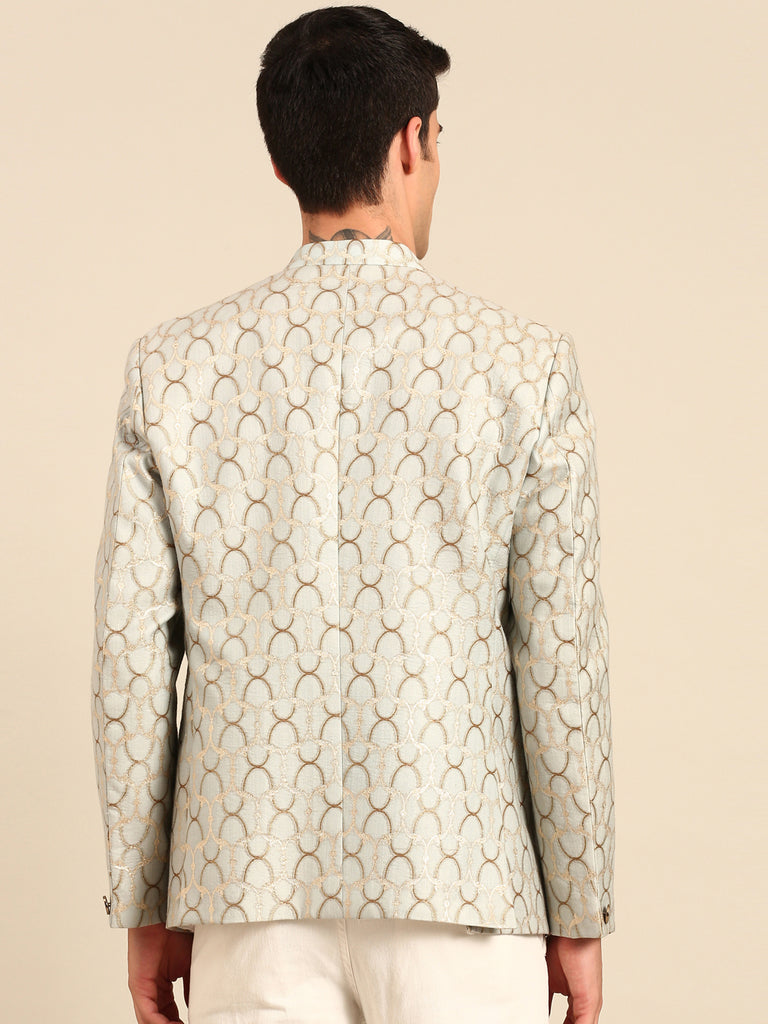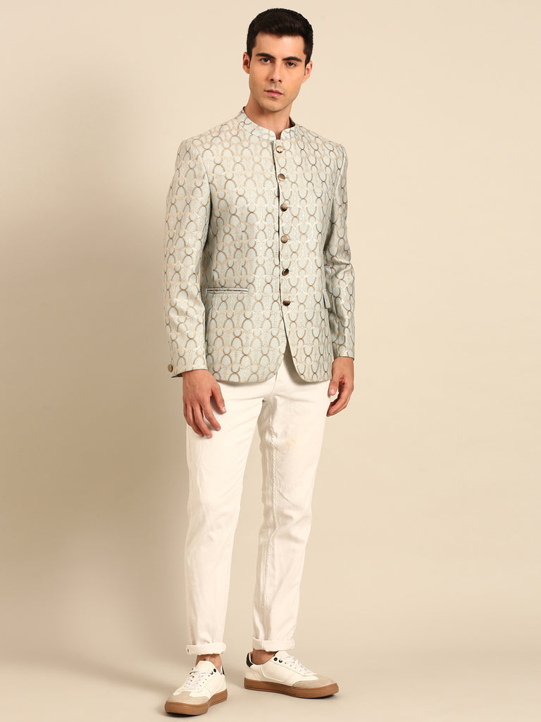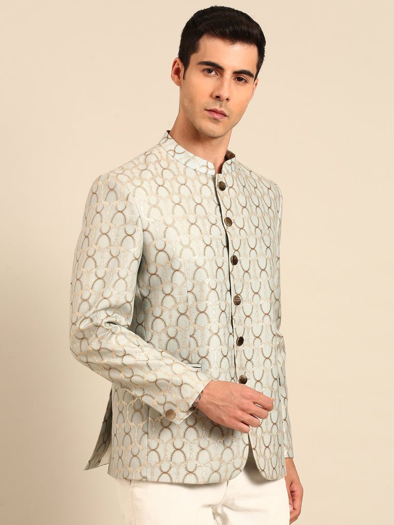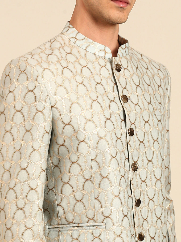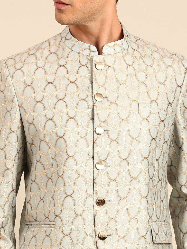Light Blue & Gold Chanderi Silk Jaquard Bandhgala - MMJ0170