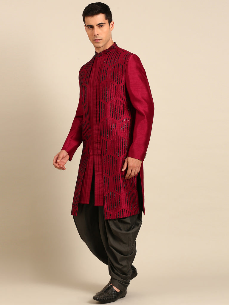 Maroon Black Bemberg Silk Sherwani - MMSHR055